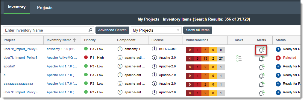 4. To view the open and closed alerts for a given inventory item associated with a given project, locate the item, and click the icon in the Alerts column.