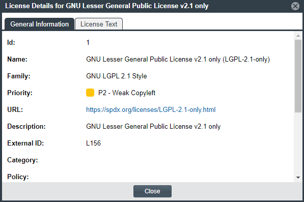 • A General Information tab that lists details such as the name of the license, its family, and the license priority assigned by Code Insight.